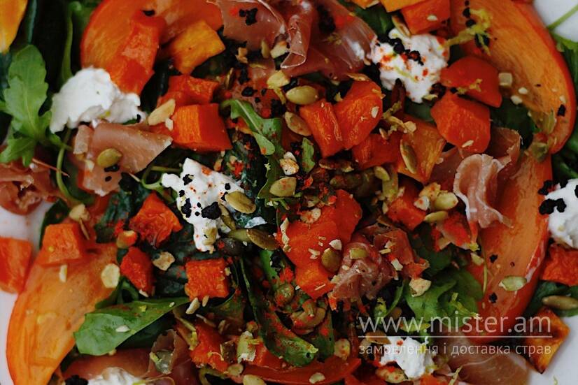 Салат з хурмою, запеченим гарбузом, прошуто та страчателою