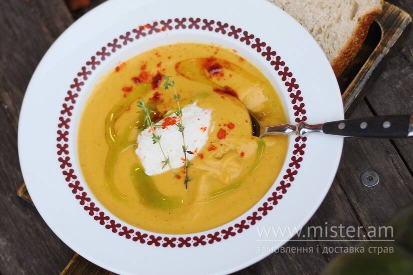 Гарбузовий крем-суп з вершками, ароматною оливковою олією та кремом із пармезану, подаємо з хлібом на заквасці.