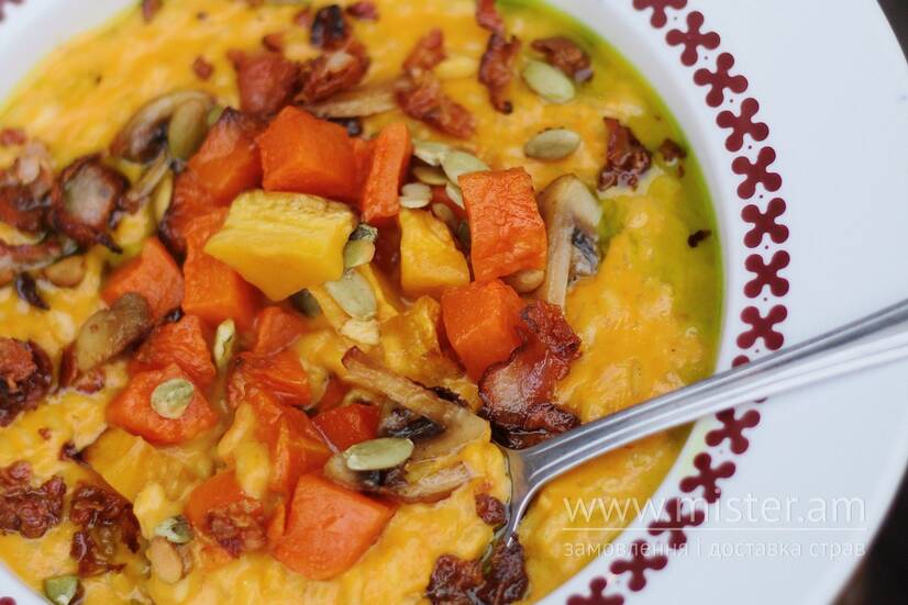 Ніжне різотто з запеченим гарбузом та беконом з додаванням грибів, цибулі, пармезану та два вида масла: соняшникова олія та зелена олія.