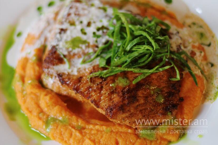 Філе індички на ніжному бататовому пюре, доповнене вершковим соусом, і краплею зеленої олії.