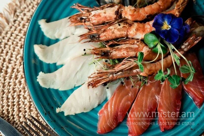 Лосось слабосолоний, масляна риба, креветки, мідії половинки, мікрогрін.