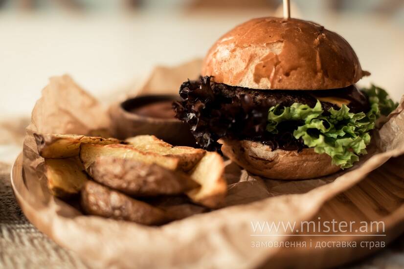 Бургер з яловичиною, картоплею по-селянськи та кетчупом