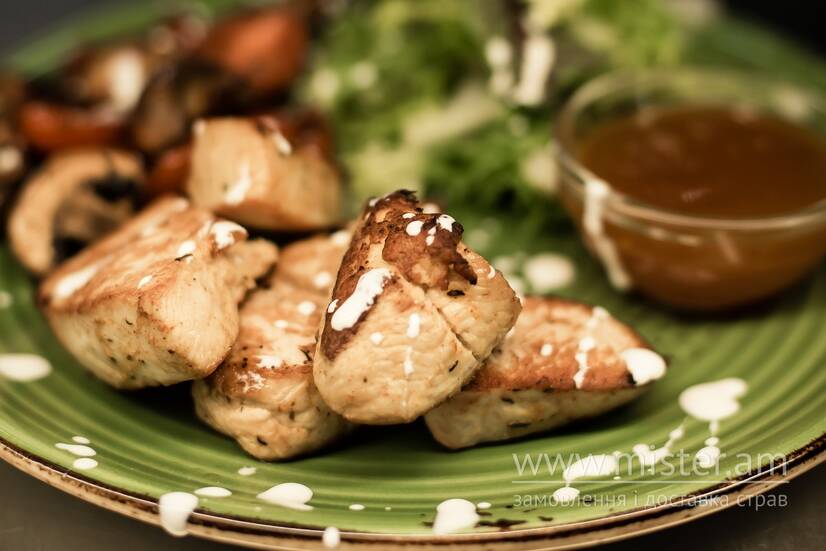 Індичка з печерицями, томатами та кисло-солодким соусом