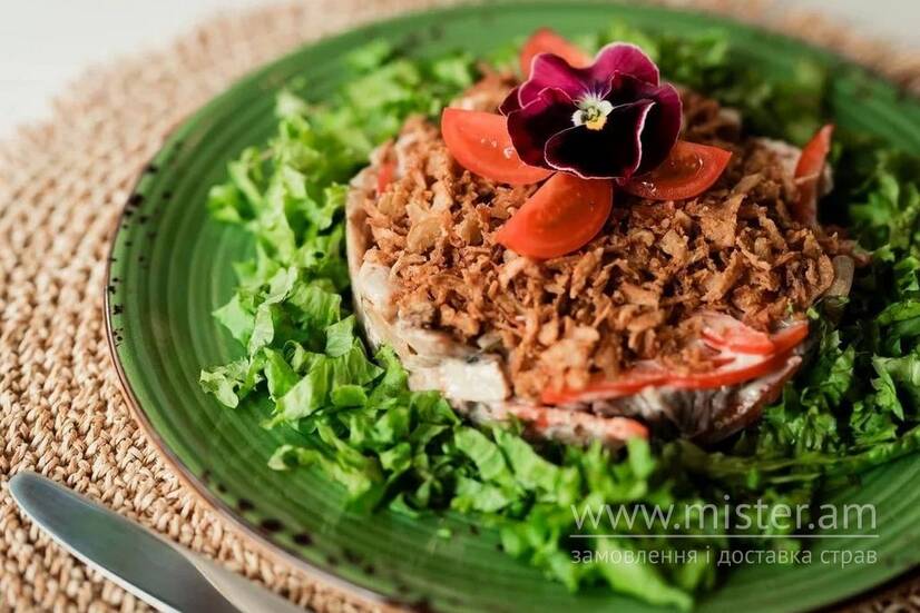 Печериці, телятина, індичка, цибуля, огірок солоний, перець болгарський, салат, чері, пармезан.