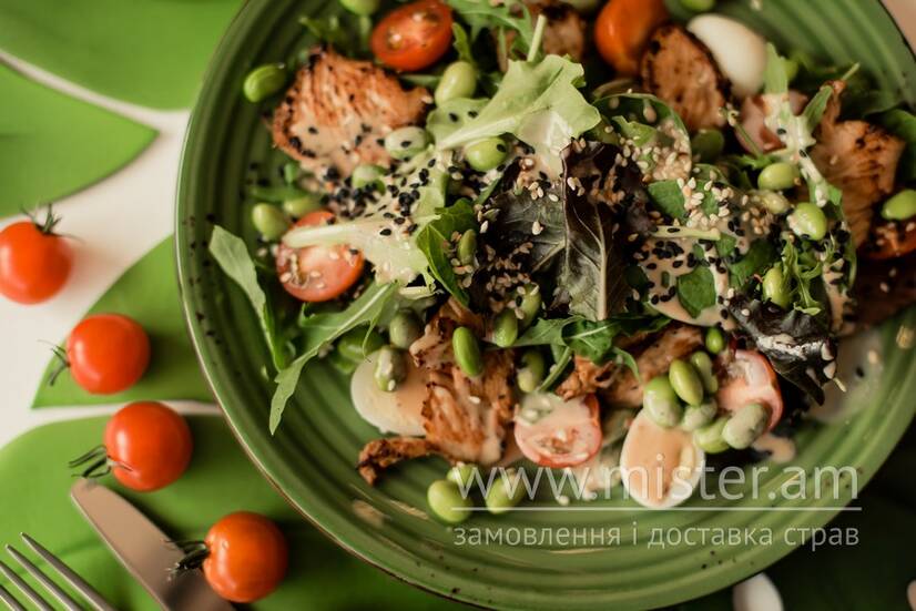 Індичка, сухарики, черрі, яйця перепелині, мікс-салат, кунжут, вершковий унагі соус.