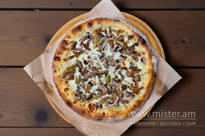 Лисички, печериці, оливки пікантні, моцарела, трюфельна олія, соус вершковий, основа.