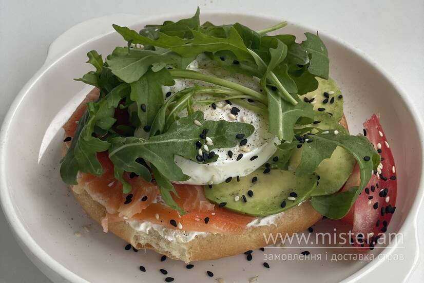 Тост, смажений на грилі, з лососем, крем-сиром, яйцем пашот, авокадо та свіжою руколою.