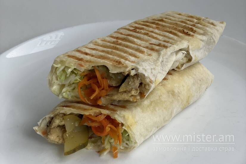 Обсмажене куряче філе, морква по-корейськи, свіжа капуста, маринований огірок, з додаванням майонезу та гірчиці, загорнуті в смачний лаваш і обсмажені на грилі.