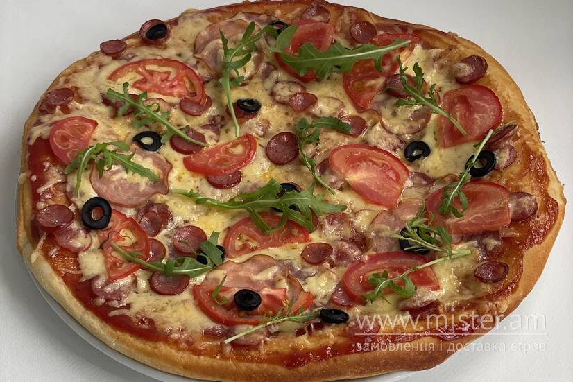 Піца з шинкою, мисливськими ковбасками, помідорами та маслинами.