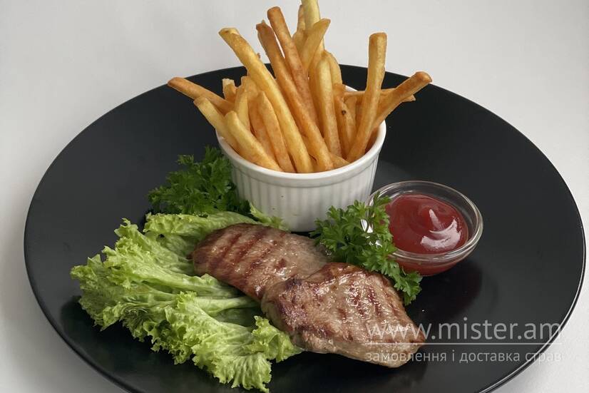 Свинина, смажена на грилі з картоплею фрі та кетчупом.