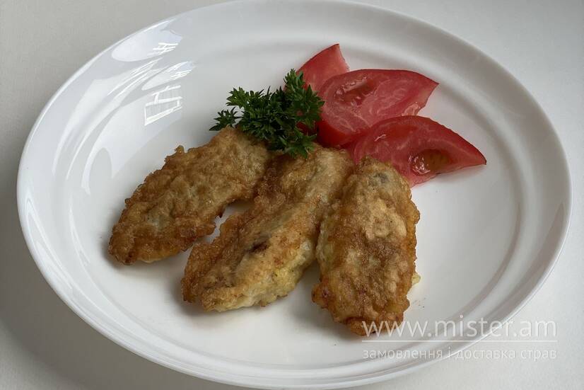 Морська риба, смажена в клярі, зі свіжим помідором.