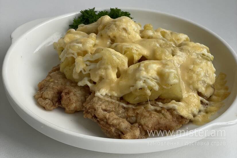 Картопля відварена, запечена під сиром з відбивною з курки.