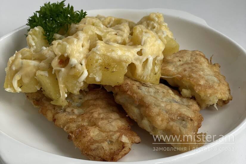 Картопля відварена, запечена під сиром зі смаженою рибою.