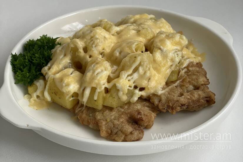 Картопля відварена, запечена під сиром з відбивною зі свинини.