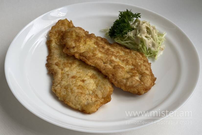 Відбивна з курки, смажена в клярі, з салатом з капусти.