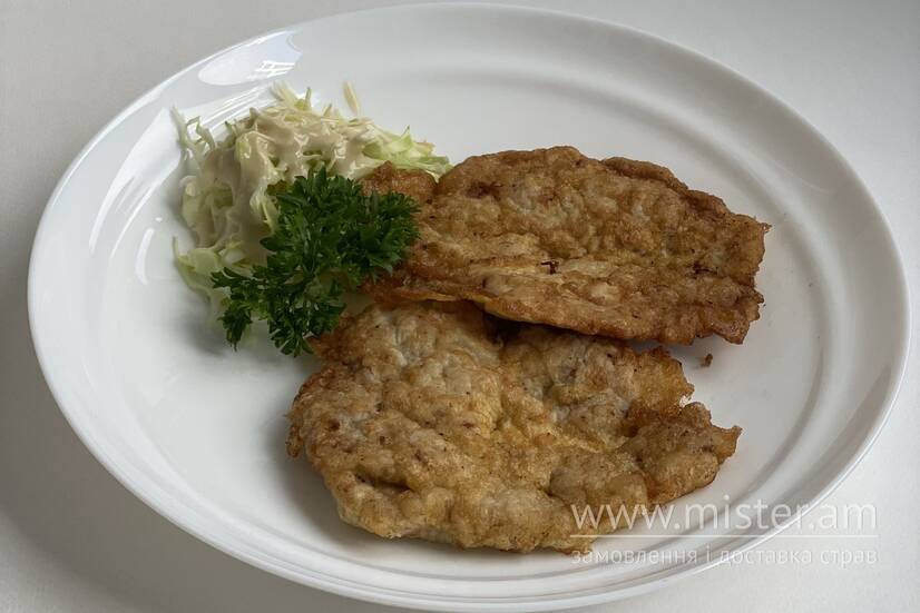 Відбивна зі свинини, смажена в клярі, з салатом з капусти.
