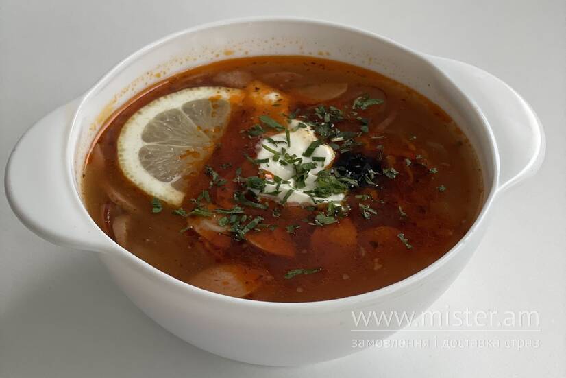 Запашна солянка, зварена на бульйоні з різноманітними копченими м'ясопродуктам - сосисками, копченою ковбасою, мисливськими ковбасками, з солоним огірком, лимоном і маслинами з додаванням сметани.
