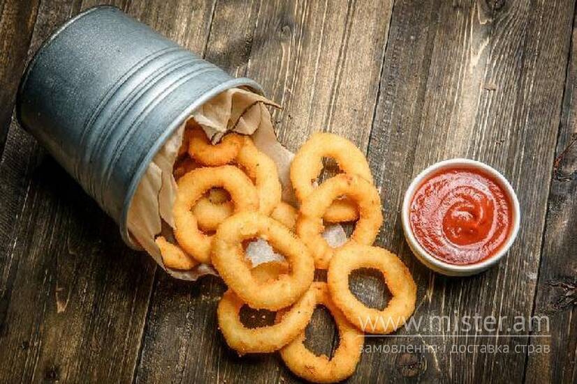Цибулеві кільця в поєднанні з кисло-солодким соусом.