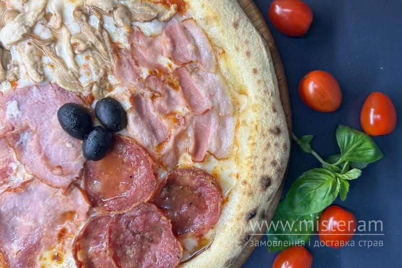 Соус пілаті , сир моцарела, мариноване курча, салямі Наполі, бекон, шинка, маслини.