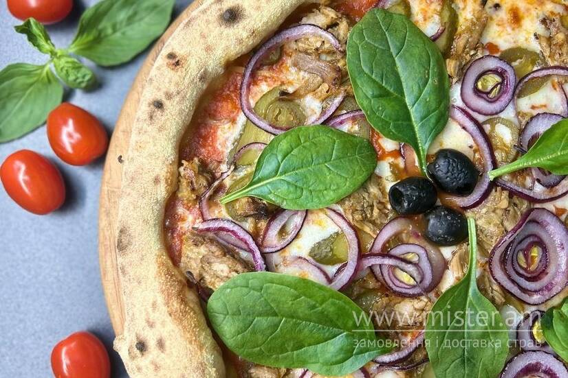 Соус пілаті, сир моцарела, томлена свинина, огірок маринований, халапеньйо, цибуля червона, шпинат, маслини.