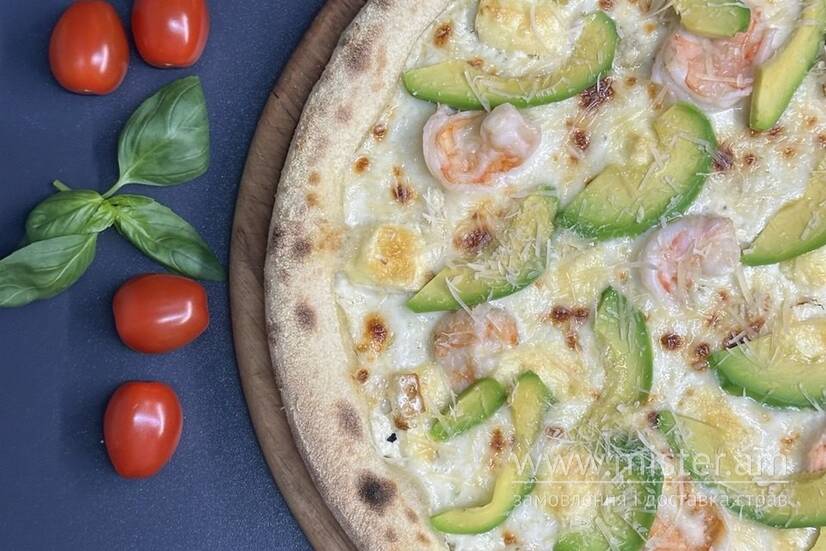 Соус часниковий, соус вершковий, сир моцарела, тигрова креветка, авокадо, сир пармезан, маслини.