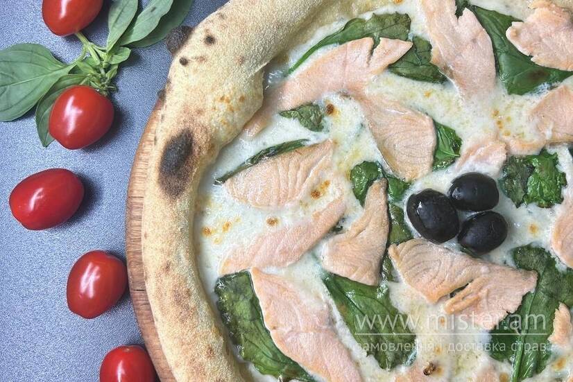 Соус вершковий, сир моцарела, лосось, листя шпинату, маслини.