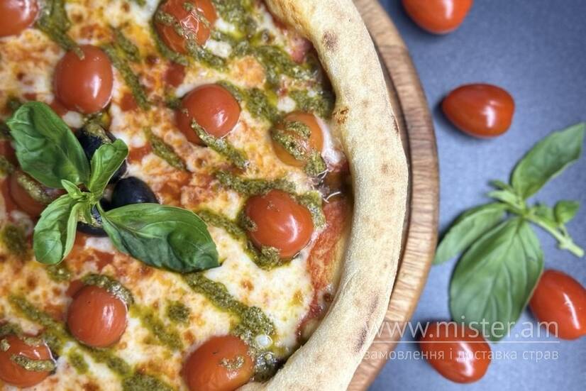 Соус пілаті, сир моцарела, томати чері, соус песто, маслини , базилік.