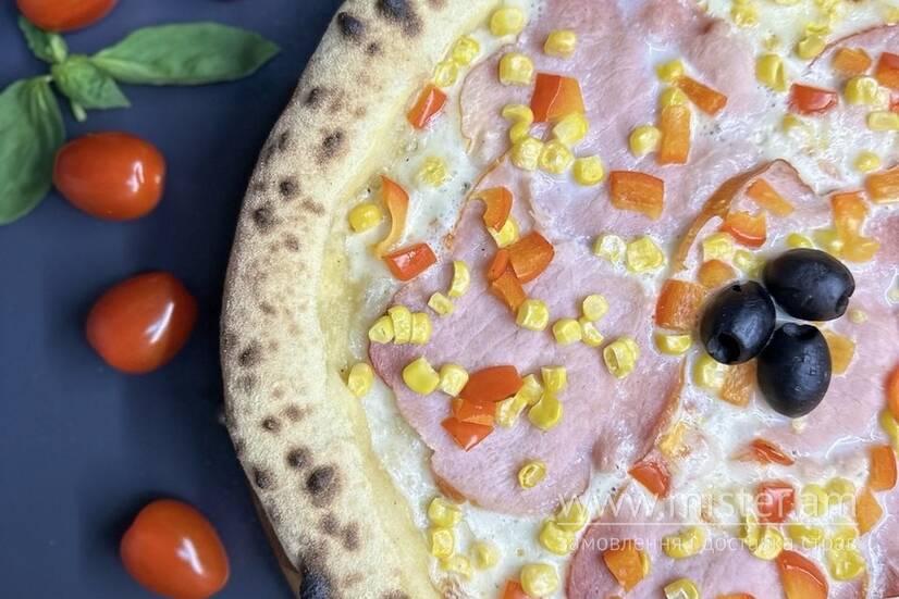 Соус вершковий, сир моцарела, шинка, солодкий перець, кукурудза, маслини.