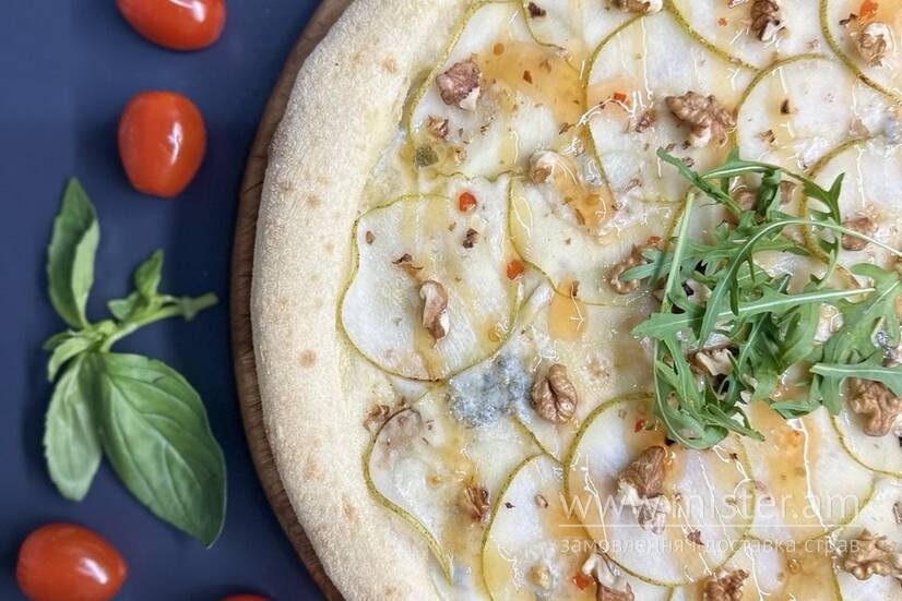 Соус вершковий, сир моцарела, сир горгонзола, груша, волоський горіх, соус світ-чилі з медом, рукола, маслини, брусничний соус (окремо).