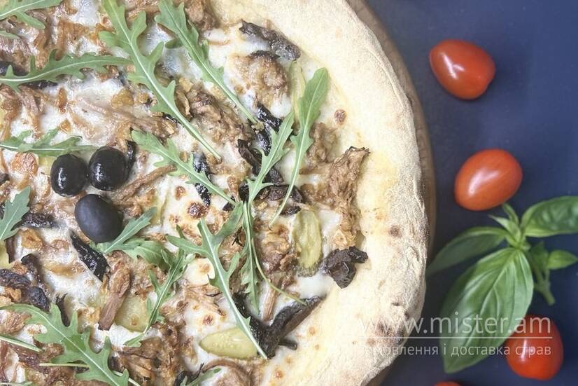 Соус вершковий, сир моцарела, свинина томлена, солоний огірок, печериці, чорнослив, цибуля ретро, сир пармезан, кріспі цибулеві, маслини.