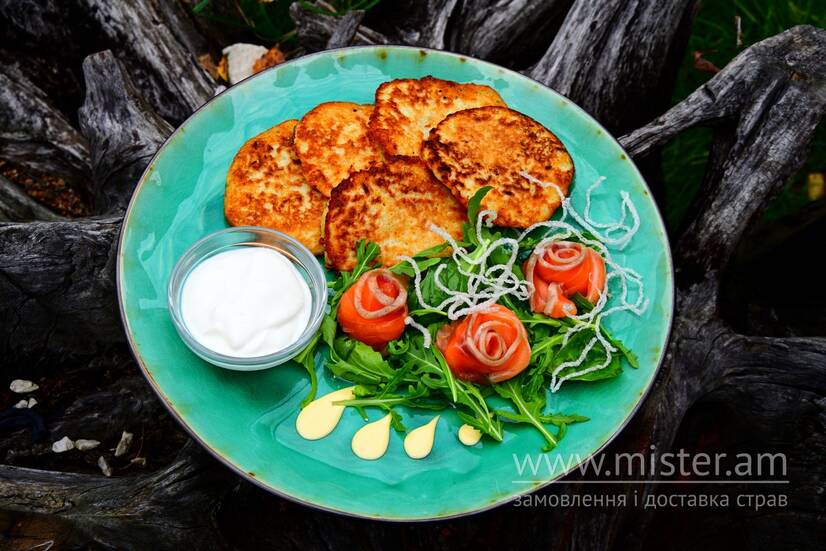 Деруни, лосось, руккола, подається із соусом світ чілі.