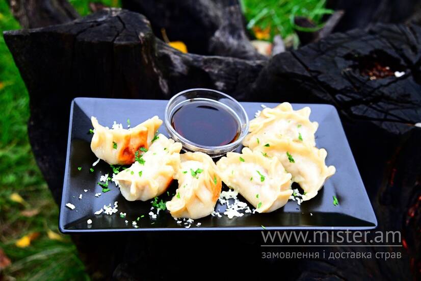 Начинка: капуста, м'ясо свинина, імбир, сир моцарела. Подаємо з нашим фірмовим соусом на основі соєвого соуса з додаванням оцту.