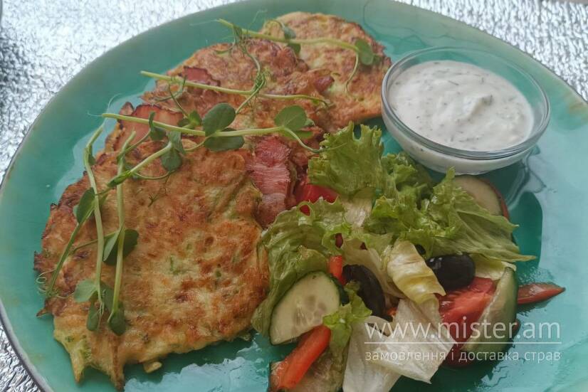 Ресторація Озеро Кабачкові оладки з беконом і легким салатом