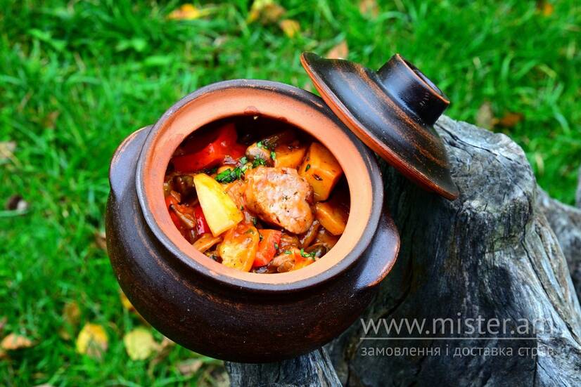Картопелька, ковбаска домашня, печериці, томати, паприка, цибулька.