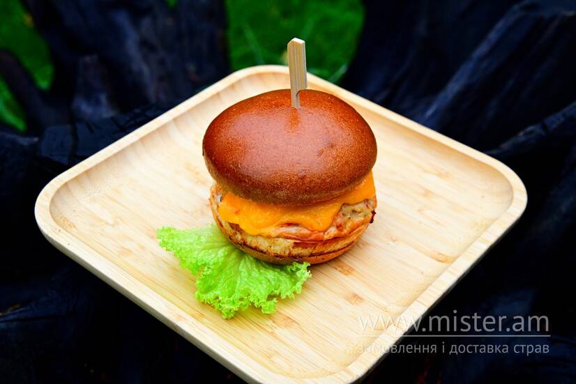 Волокно куряче томлене в смокері, булочка бріош, томати, сир чеддер, фірмовий соус для бургера та барбекю.