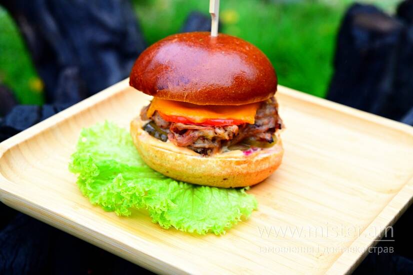 Волокно свинини томленої в смокері, булочка бріош, огірок квашений, маринована цибулька, сир чеддер, томати, фірмовий соус для бургера та барбекю.