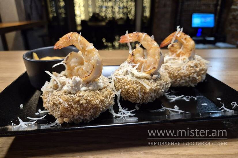 Грибочки обсмажені у фритюрі в хрусткій паніровці фаршировані неперевершеним вершково-грибним соусом. Композицію доповнює королівська креветка засніжена пармезаном.
