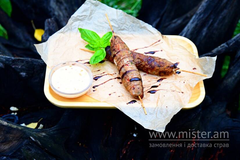 Зі свинини з додаванням курочки, кінза, крем бальзаміко, кетчуп, паприка, часник і перець чілі.