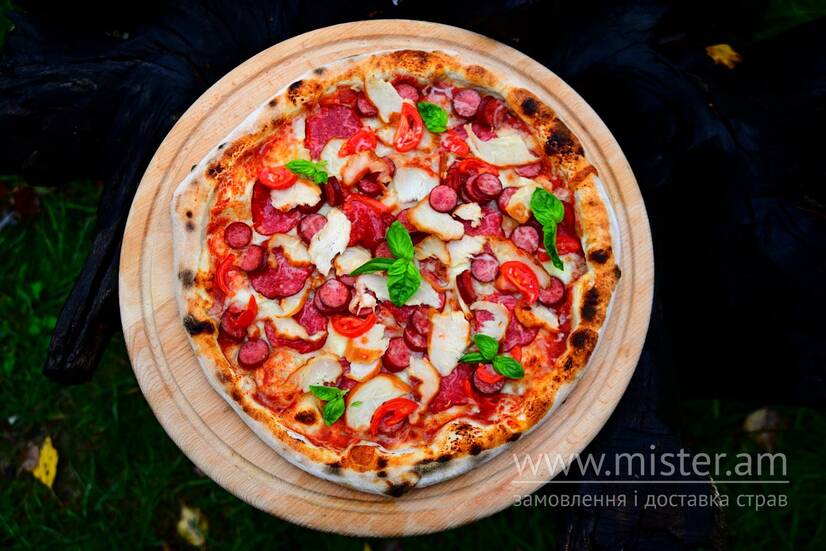 Мисливські ковбаски, салямі, шинка куряча копчена, чері, пармезан, моцарела, соус пелаті.