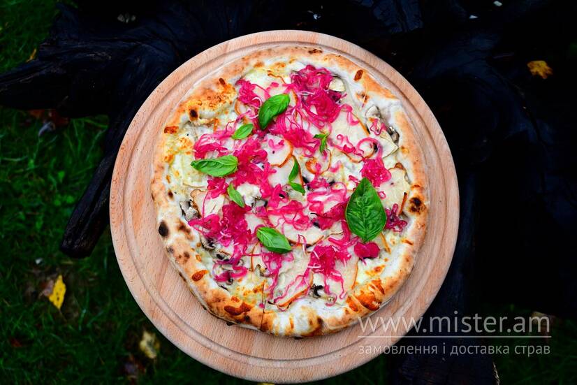 Печериці, маринована цибулька, шинка куряча копчена, моцарела, пармезан, вершковий соус.
