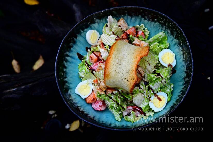 Мікс салату, лосось грильований, чері, яйце перепелине, пармезан, сухарики – заправлено соусом Цезар.