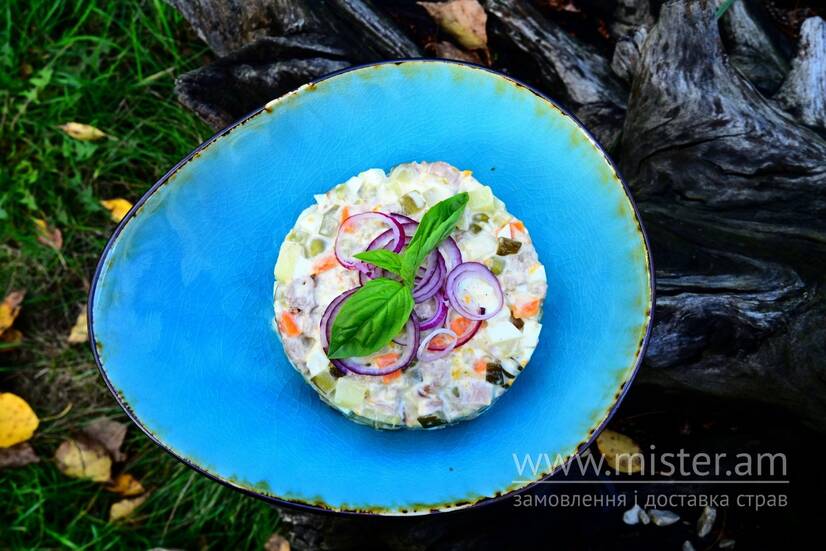 Телятина, картопля, морква, огірок солоний, яйце, горошок зелений, кунжут, майонез.