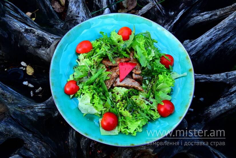 Мікс салату, чері, паприка, пармезан, телятина, унагі, чілі, лимон.