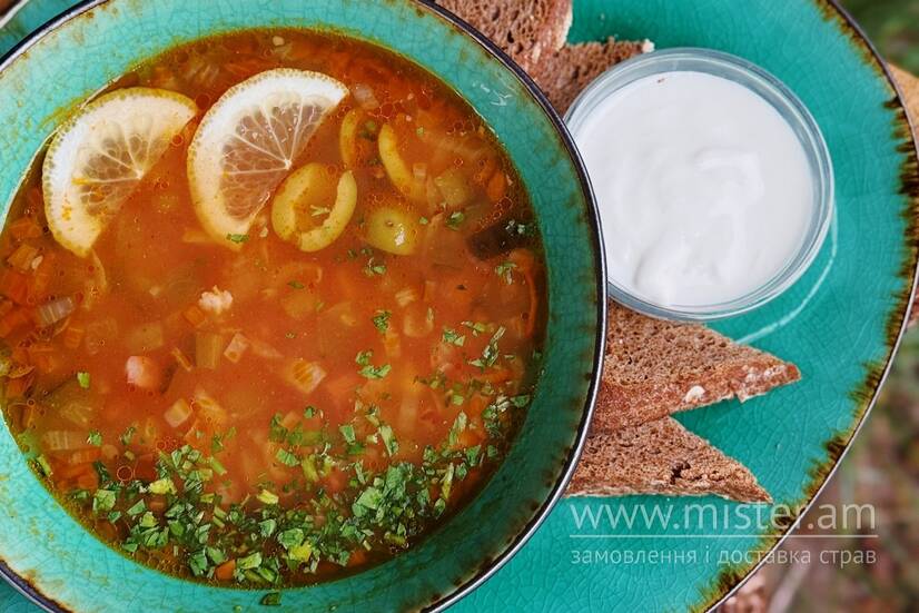 Зварена на основі 6 видів м’яса, для пікантності додаємо солоний огірок та оливки. Сметанка та гріночки - бонусом.