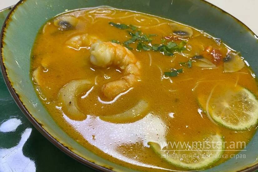 Тайський суп, вміру гострий з рисовою локшиною і морепродуктами.