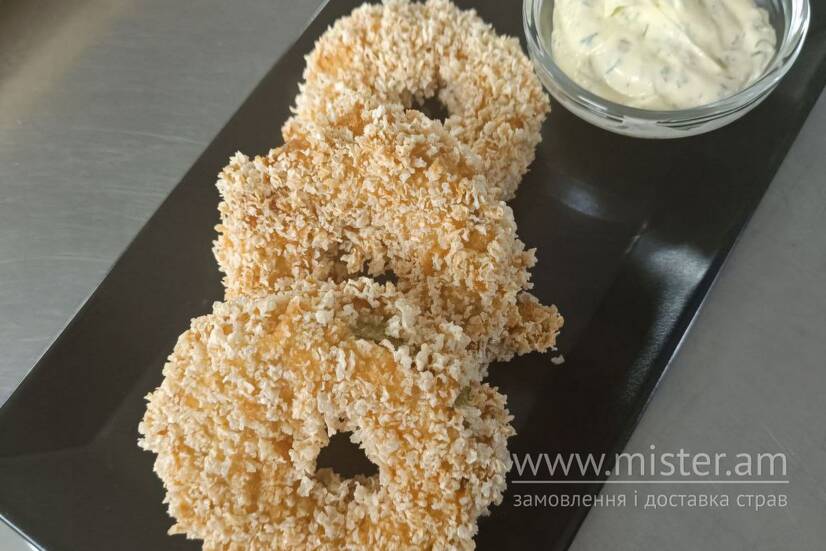 Кільця кабачка обсмажені у фритюрі в хрусткій паніровці із пікантним соусом.