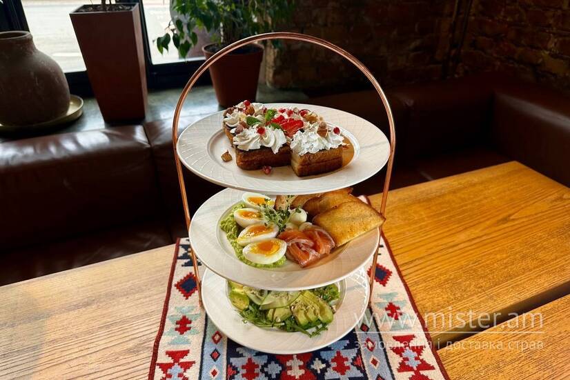 - відварені яйця з лососем на подушці з гуакамоле (авокадо, фреш лимона, сіль), бейбі моцарелою та булочкою бріош;