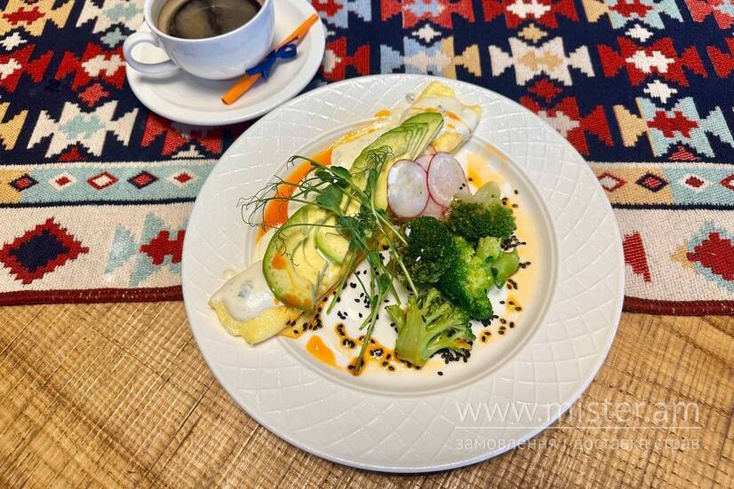 Омлет з легкою текстурою подається з броколі, авокадо та хрумкою редискою. Страву доповнює насичений соус дор блю, що додає глибини смаку. Прикрашаємо чорним кунжутом, мікрогріном і ароматною олією з паприкою, які роблять страву ще більш апетитною та яскравою.