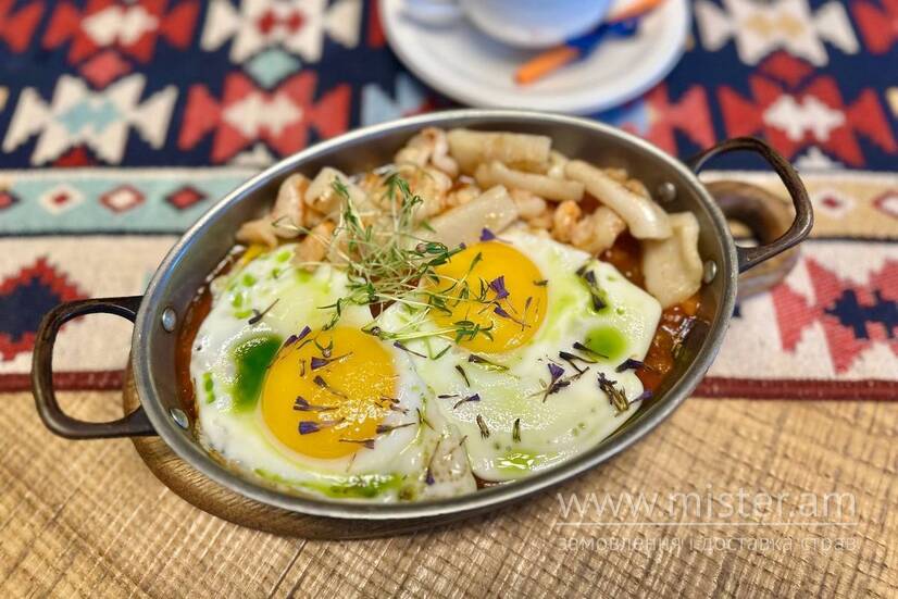 Ароматна шакшука з овочами у томатному соусі зі смаженими яйцями, соковитими креветками та кальмарами. Подається із зеленим маслом, що додає страві свіжого аромату та завершеного смаку.