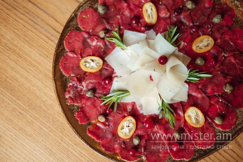 Тонко нарізані слайси яловичини, викладені на соус бальзамік в поєднанні з пармезаном та каперсами.